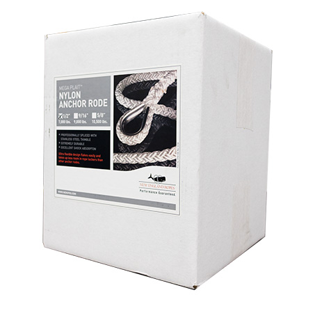 Mega Plait line is designed for use in mechanical windlasses without abrading or fraying. Made of high-quality premium nylon, this rope is supple and easy to handle. It flakes and coils tightly and takes up less space than traditional nylon rodes in your anchor locker. We professionally splice each line with a stainless thimble and a heat-sealed bitter end.